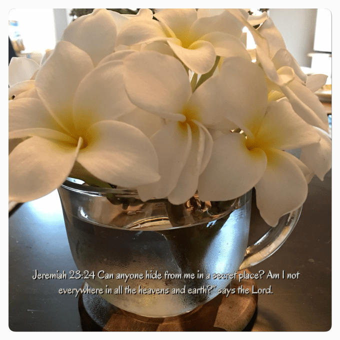 This summer I’m Leading a small group Bible Study within our Ladies’ Ministries at Church. Last night as I was processing my Assignment, there was the reminder about Adam and Eve’s attempt to hide from The Lord after they had sinned. As I was opening up my Bible this morning, the daily verse from Jeremiah was staring me in the face.