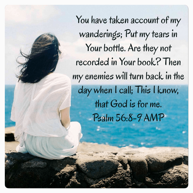 Knows your pain, Girlfriend. And as our Scripture verse above reminds us: He saves our tears in a bottle. That is the most amazing and loving thing — God is genuinely concerned about our comings and goings. He knows our wanderings.